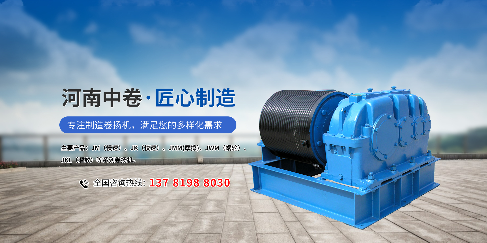 公司主要產品:JM(慢速)、JK(快速),JMM(摩擦),JWM(蝸輪),JKL(溜放)等系列卷揚機,并承接各種非標卷揚機設計、制造。
